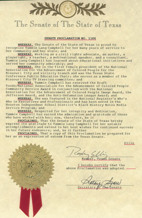 HONOR, RECOGNITION & MILESTONESThe Executive Director/Founder, Tammie Lang Campbell, has received numerous awards/honors for her community service. Some are highlighted below. Founder recognized as a “State of Texas Civil Rights Advocate" under HR 1705; recipient of the following: 2011 North Houston Frontier’s “Dr. Martin Luther King, Jr. Drum Major” Award; “Aetna Medicare Magic Touch” Award in conjunction with Aetna Medicare, Magic Johnson Enterprises and SMSi Urban Call; “Kraft Food Inc./NAACP Community Service Image Award"; "Jefferson Award"; Rolling Out Magazine's "Top 25 Women in Houston" Award and NAACP Texas State Conference “Torchbearer Award.” Founder featured as a history maker on "Making History Today" KHOU-TV Channel 11 and Houston ISD Instructional Media Services’ Black History Notes TV program. Founder selected as Education Chair of the NAACP Texas State Conference and as President of Missouri City NAACP Founder served on The Civil Rights Project at Harvard University's Roundtable Discussion entitled, "Building Capacity for State-Level Advocates to Address the School to Prison Pipeline" Former Mayor of Houston, Bill White, declared June 18, 2005, Tammie Lang Campbell’s Day for being recognized nationally as the “Role Model Beyond Beauty” in Sophisticate’s Black Hair Magazine June/July 2005 issue. She was featured again in Sophisticate’s Black Hair Magazine May/June 2006 as one of the most outstanding role models in 2005 (Rosa Parks was the first role-model featured). 2014 Top Rated Nonprofit